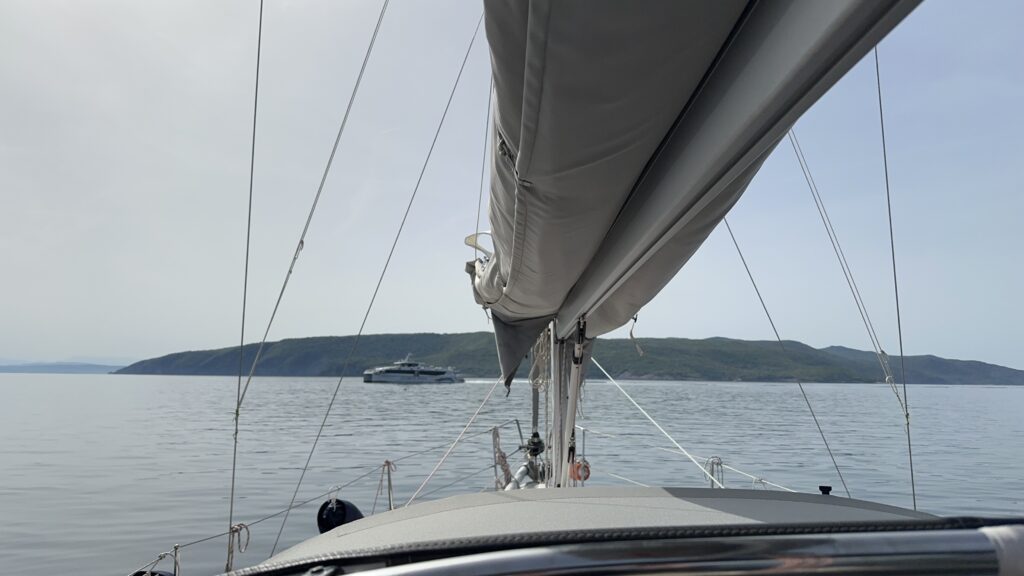 Heute geht es mangels Wind unter Maschine von Opatija morgens um 0845 los. Kein Segelwind, daher eine fast reine Motorfahrt, die für den Volvo natürlich gut ist. Nördlich des Verkehrstrennungsgebiets geht es auf die Seite Cres, um dort nach der Küstenverkehrszone den direkten Kurs in den Ort Cres zu nehmen. Da auf dem AIS sichtbar war, wie südlich des VTG die Katamaran-Fähre einfährt und die OpenToBe nördlich des VTG natürlich viel langsamer agieren kann, habe ich frühzeitig die Abstimmung mit dem Kapitän gesucht. Er weist an, den Kurs zu halten. Er geht sicher vor der OpenToBe durch. Solche Abstimmung über Funk sind hilfreich.
