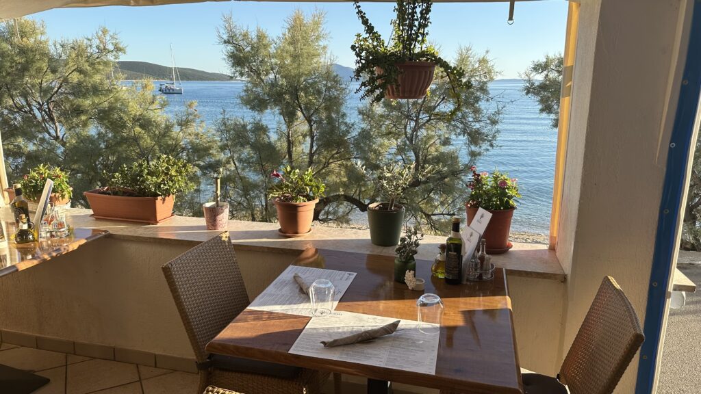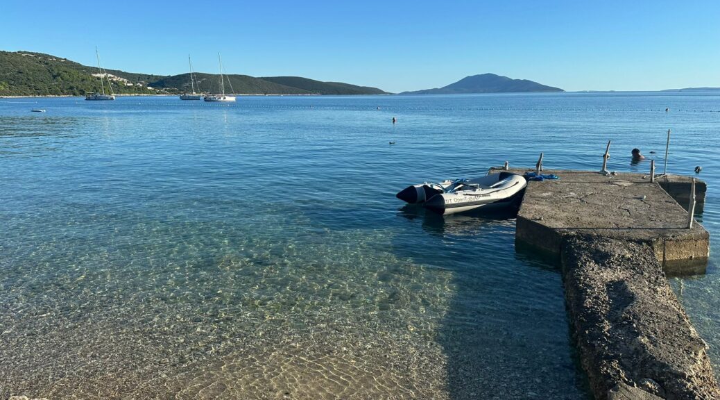 Wir legen ab, um bei sonnigem Wetter zunächst Cres Nordkap anzusteuern. Auf der Westseite von Cres geht es durch die Küstenverkehrszone östlich und außerhalb des Verkehrstrennungsgebiets nach Süden. Vor Martinscica fällt der Anker auf bestem Ankergrund. Inzwischen ist der Badebereich mit einer Schwimmleine abgetrennt, daher paddeln wir zur guten Konoba Koralj.